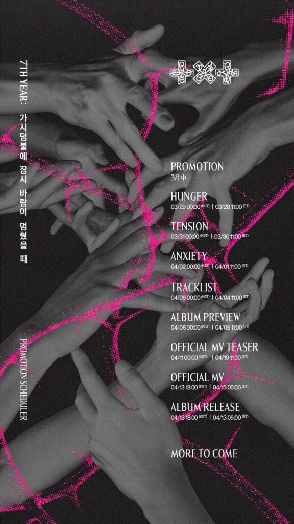7TH YEAR: 가시덤불에 잠시 바람이 멈췄을 때 – Promotion Scheduler#투모로우바이투게더 #TOMORROW_X_TOGETHER #TXT#7TH_YEAR #가시덤불에_잠시_바람이_멈췄을_때 pic.twitter.com/gEdJmQSXUL